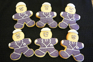 Did you know that when you try to tint royal icing black, using Wilton paste food dye, it looks more like purple? Well, it does. So my police men for the Police/Lego themed birthday party look a little purple. I made the good old "Cookie Monster Cookies" and "Royal icing" to decorate these little gingerbread shaped guys.